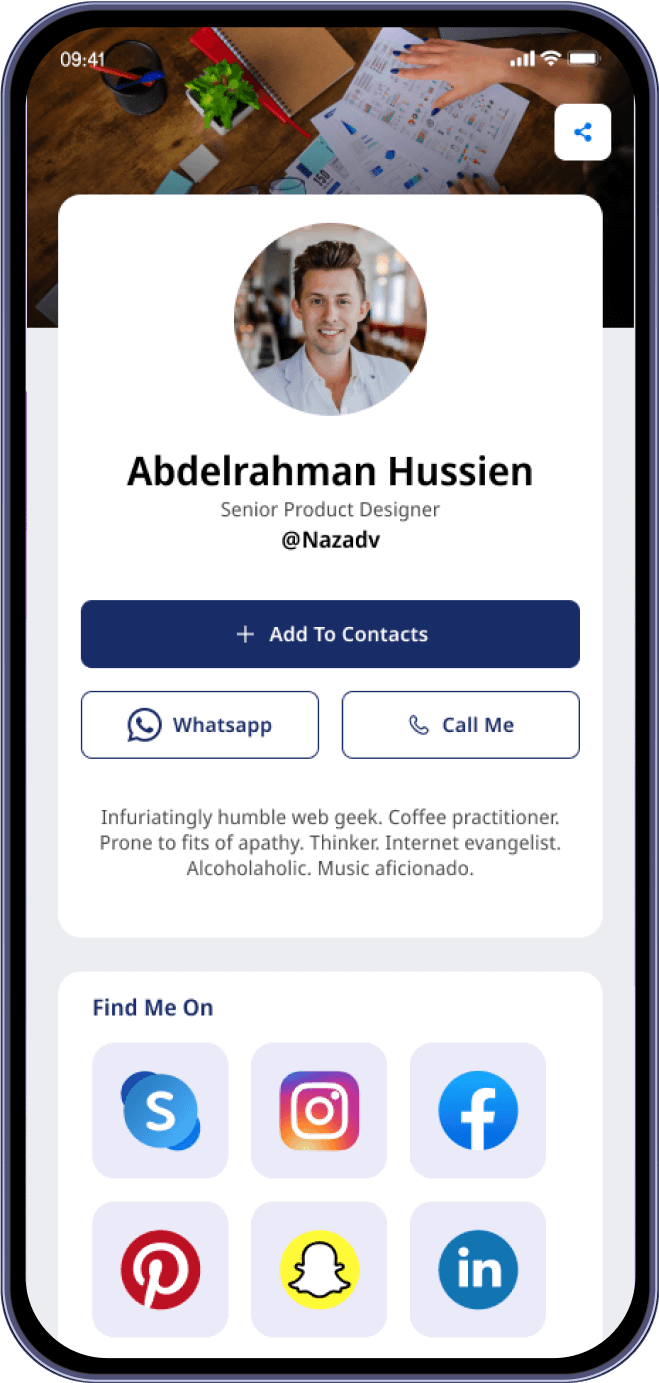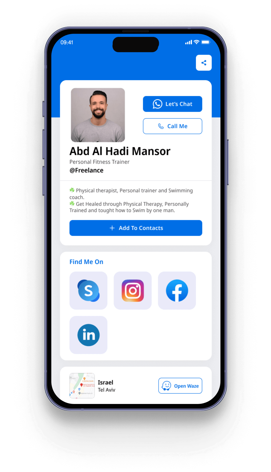Share your digital business card easily and instantly via email, text, social media, or QR code