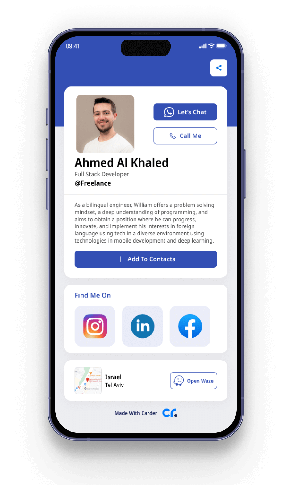 Carder is an easy-to-use platform for creating and sharing personalized digital business cards Customize your card to match your personal or Business brand and make a lasting impression